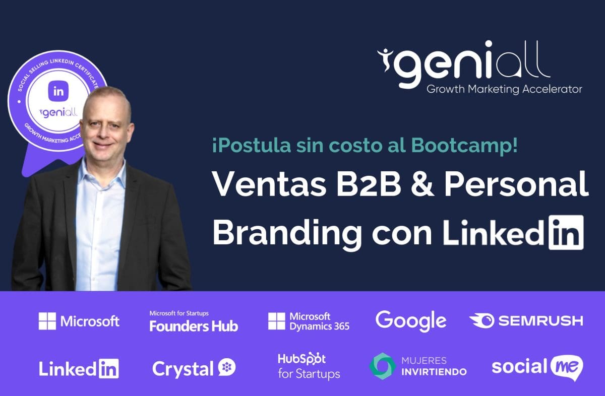 Prepárate para crecer en ventas, encontrar tus audiencias y generar vínculos de negocios. Geniall, The Growth Marketing Accelerator te invita a su próximo bootcamp de Certificación en Ventas B2B y Marca Personal con LinkedIn, iniciativa que tendrá una duración de 3 meses.
